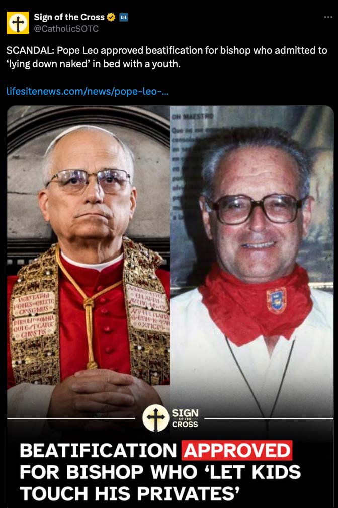LieSite News is at it again! In a post on 𝕏 they claimed Pope Leo ‘scandalously’ “approved beatification for bishop who admitted to ‘lying down naked’ with youth”